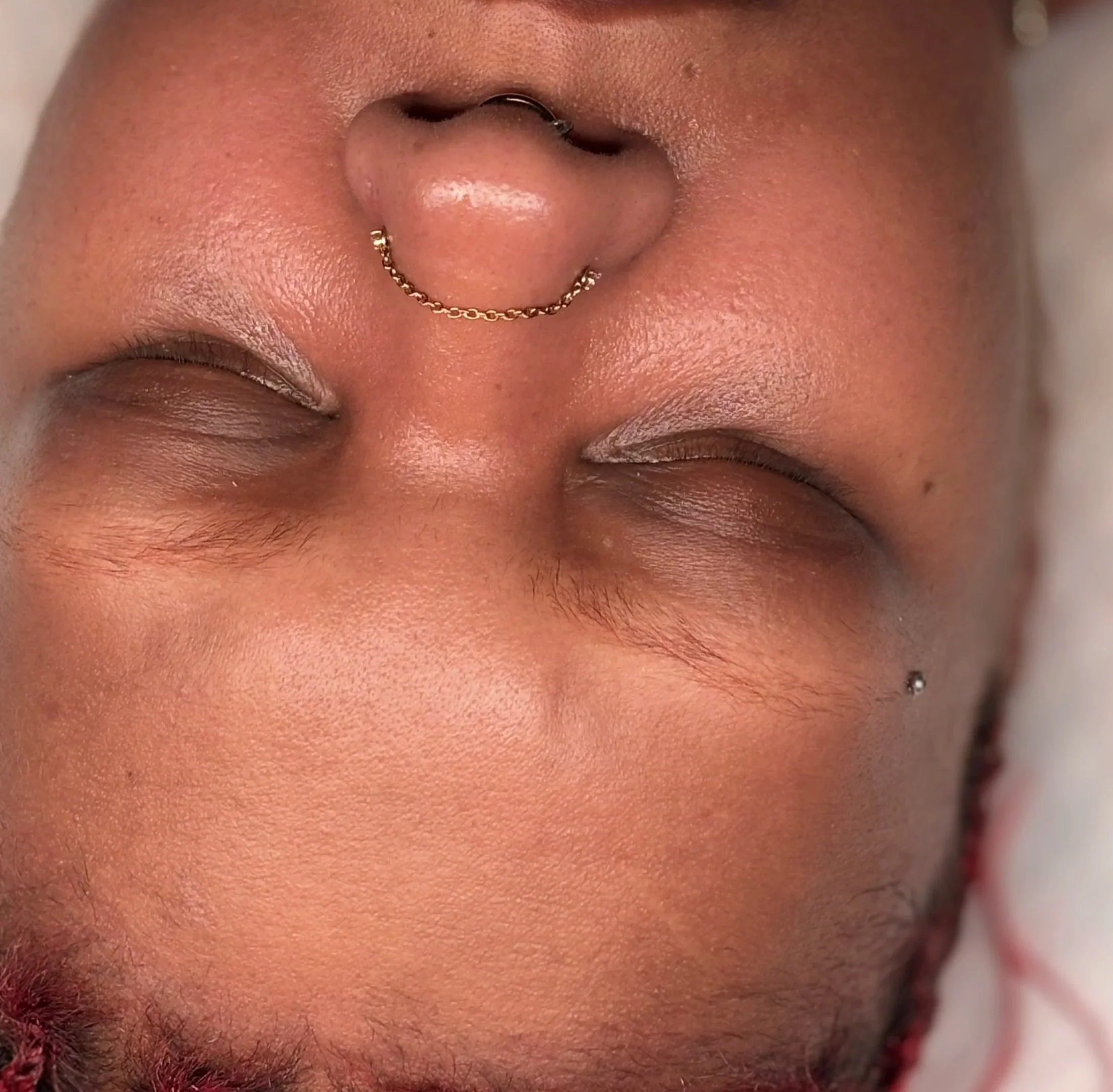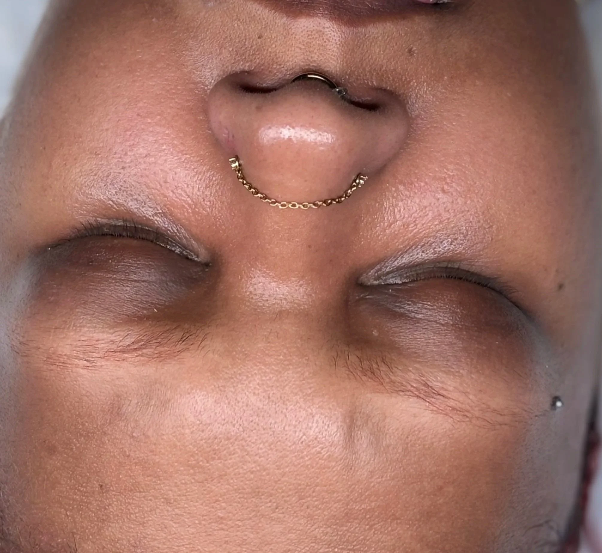 Close-up of a person's face with closed eyes, nose piercing with a gold chain septum ring, and a small black dot piercing near the mouth.